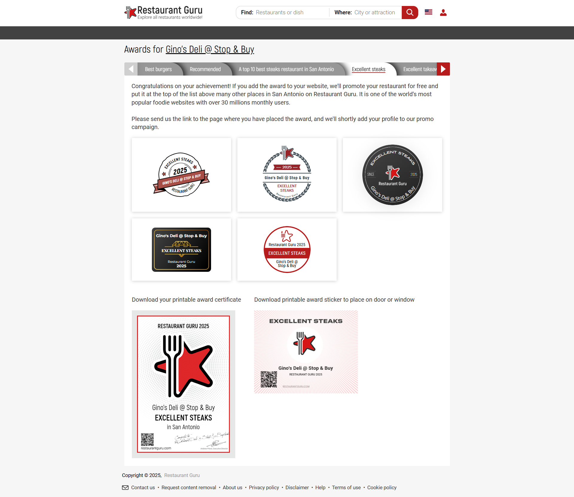 Gino’s Deli awarded one of the 10 Best Steak Restaurants in San Antonio Award by Restaurant Guru