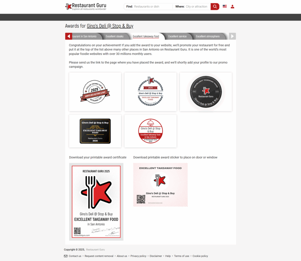 Gino’s Deli awarded one of the Best Takeaways in San Antonio Award by Restaurant Guru