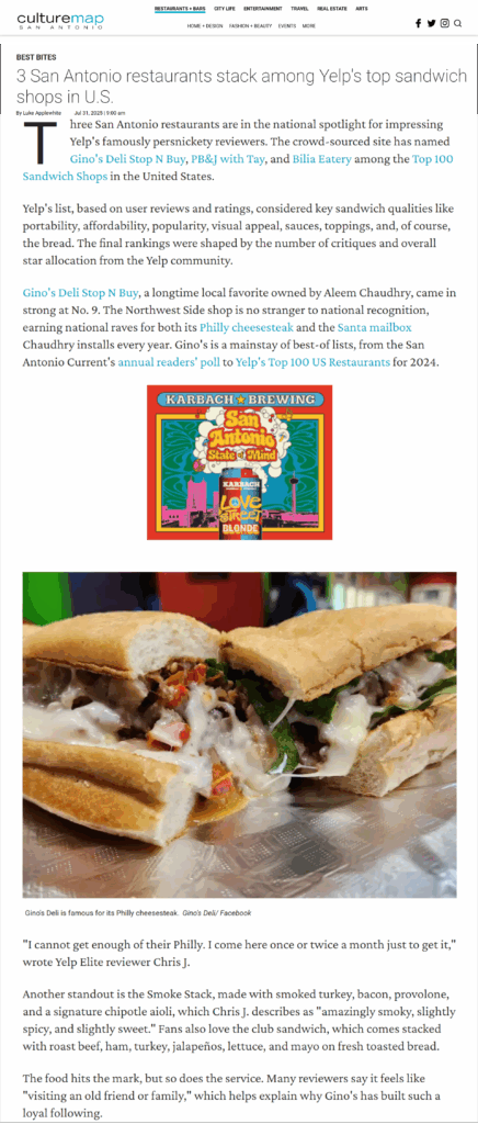 Three San Antonio restaurants are in the national spotlight for impressing Yelp’s famously persnickety reviewers. The crowd-sourced site has named Gino’s Deli Stop N Buy, PB&J with Tay, and Bilia Eatery among the Top 100 Sandwich Shops in the United States.