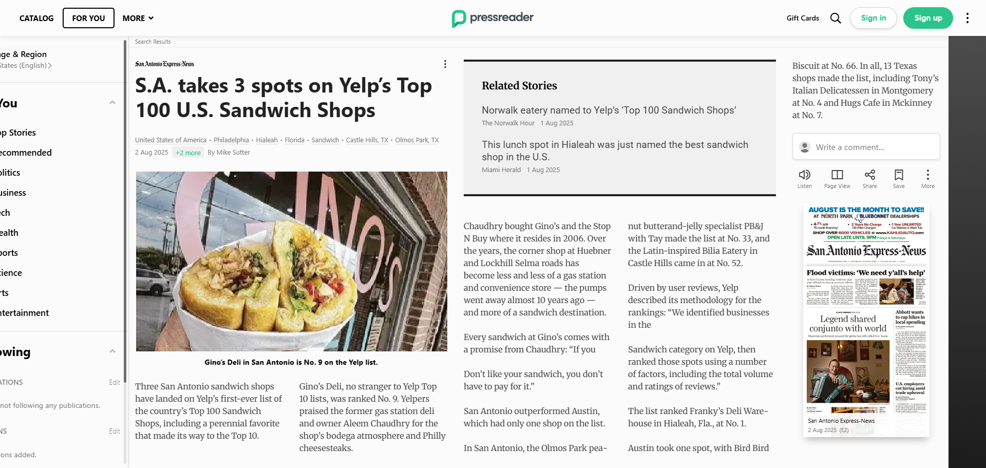 Gino’s Deli among the 2 San Antonio restaurants to make Yelp’s top 100 list for 2026