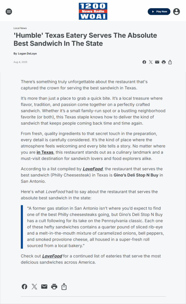 According to a list compiled by LoveFood, the restaurant that serves the best sandwich (Philly Cheesesteak) in Texas is Gino’s Deli Stop N Buy in San Antonio.