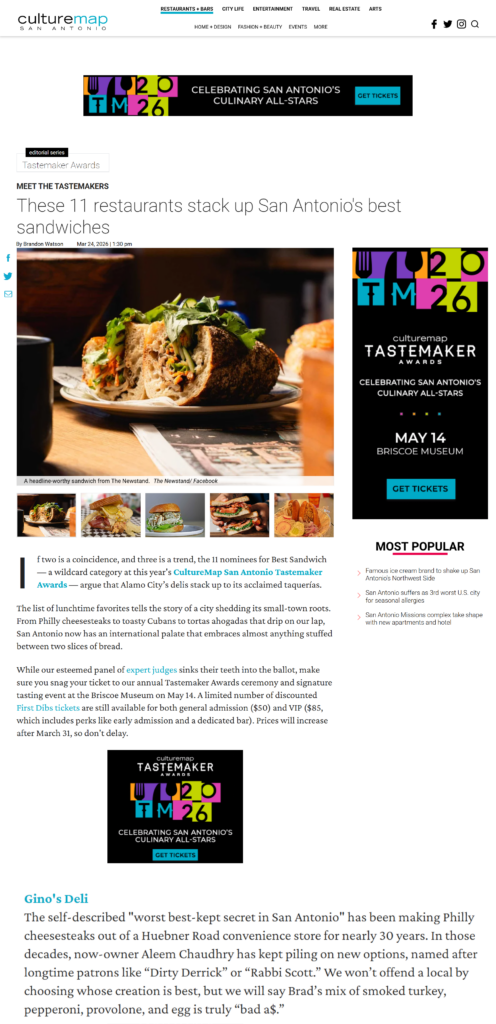 We are beyond thrilled to announce that Gino’s Deli has been nominated for the 2026 CultureMap San Antonio Tastemaker Awards in the “Best Sandwich” category by CultureMap San Antonio.