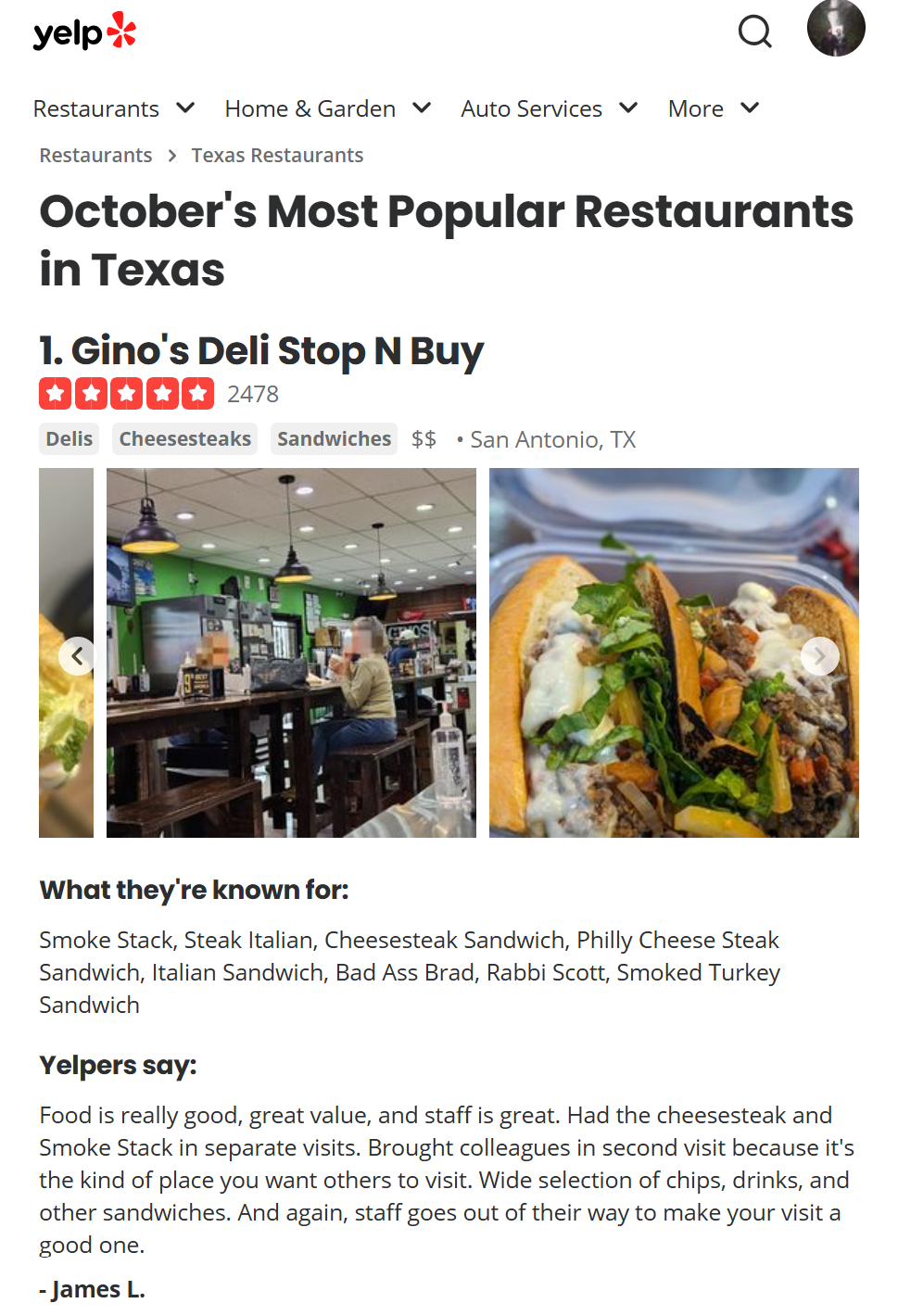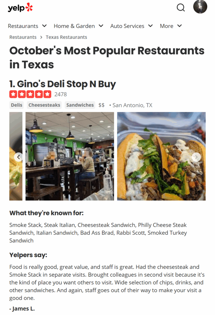 No stranger to accolades being the most awarded and written about restaurant in Texas and one of the best in United States, Gino’s Deli continues its streak of wins. For the month of October 2025 Yelp yet again ranks Gino’s Deli as the Most Popular Restaurant in Texas.
